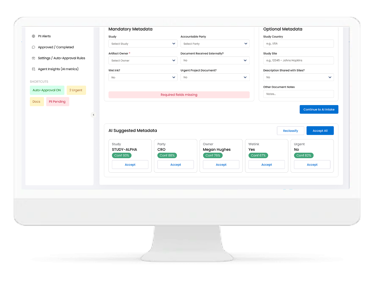 TMF Intake Agents see AI suggestions with confidence scores, quickly accept or adjust classification and metadata, and resolve QC flags.