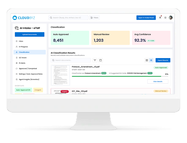- Classifies documents to the correct TMF artifact / zone / section using AI