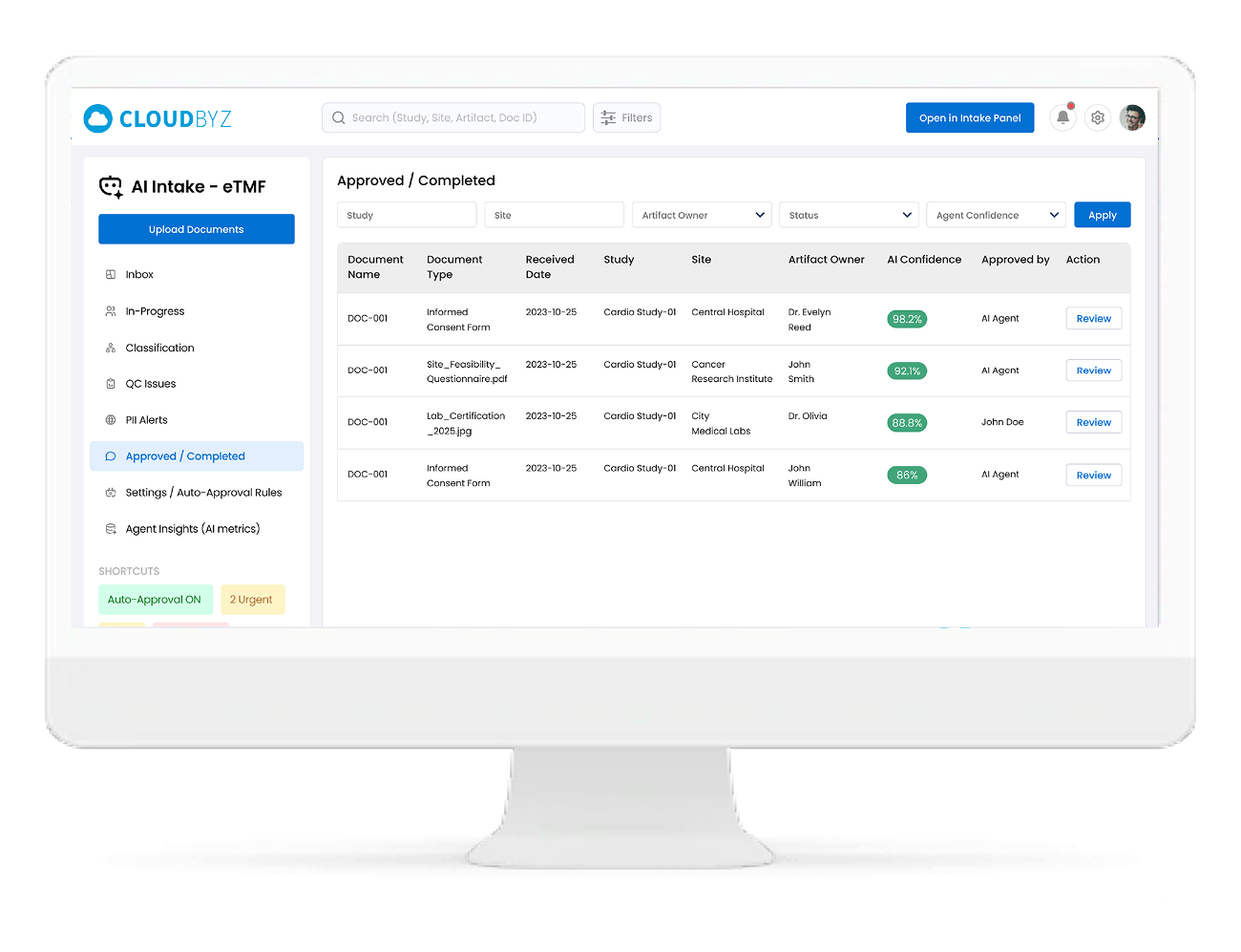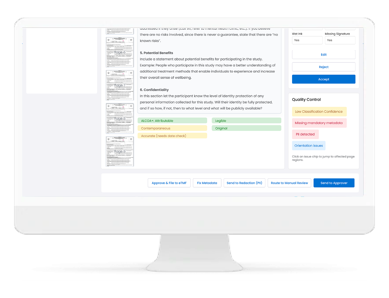 Once approved, the document is synced to your eTMF with complete, validated metadata and a full audit trail of AI and human actions.