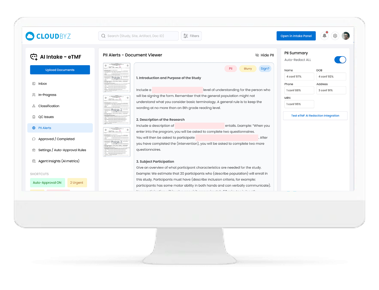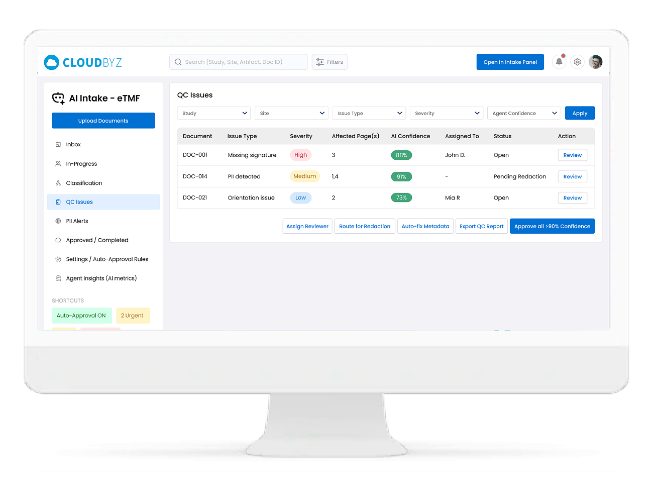Sponsors face the challenge of overseeing multiple CROs, partners, and global sites—each with different processes and document quality levels. The AI eTMF Agent enables sponsors to centralize quality, streamline intake, and ensure consistency across the entire study portfolio.