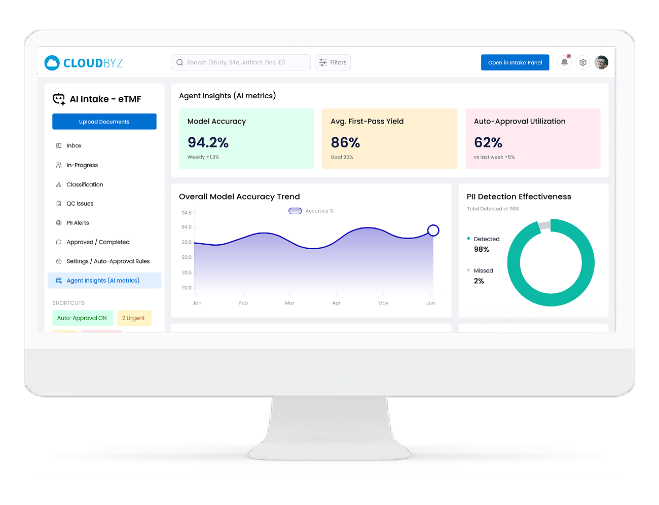 The AI eTMF Agent is a smart intake and quality assistant that sits in front of your eTMF. It automates document routing, classification,