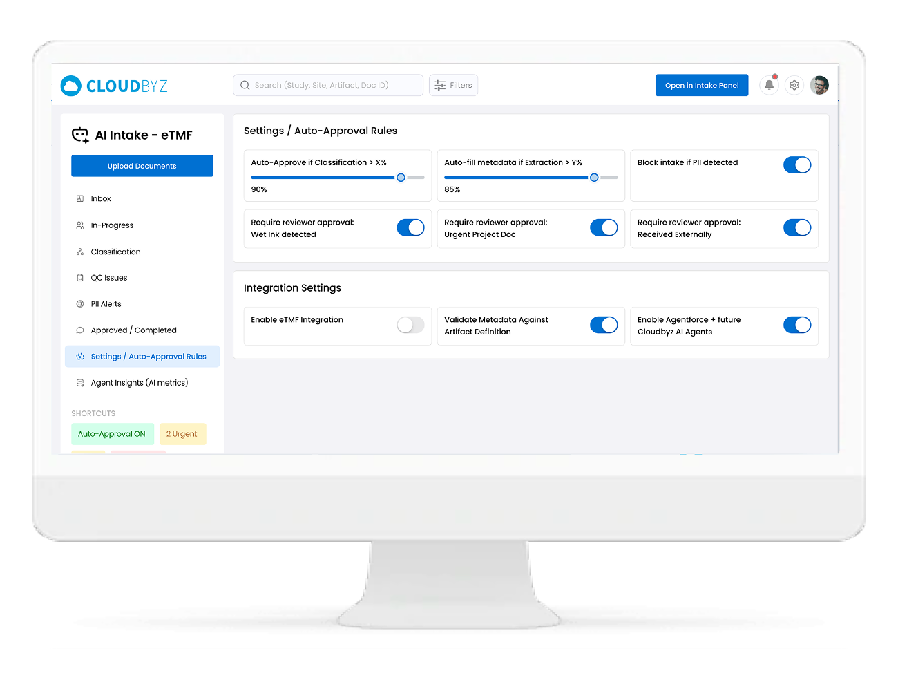 - Designed to sync with your eTMF repository (e.g., Veeva Vault, Cloudbyz eTMF, or other platforms via API)